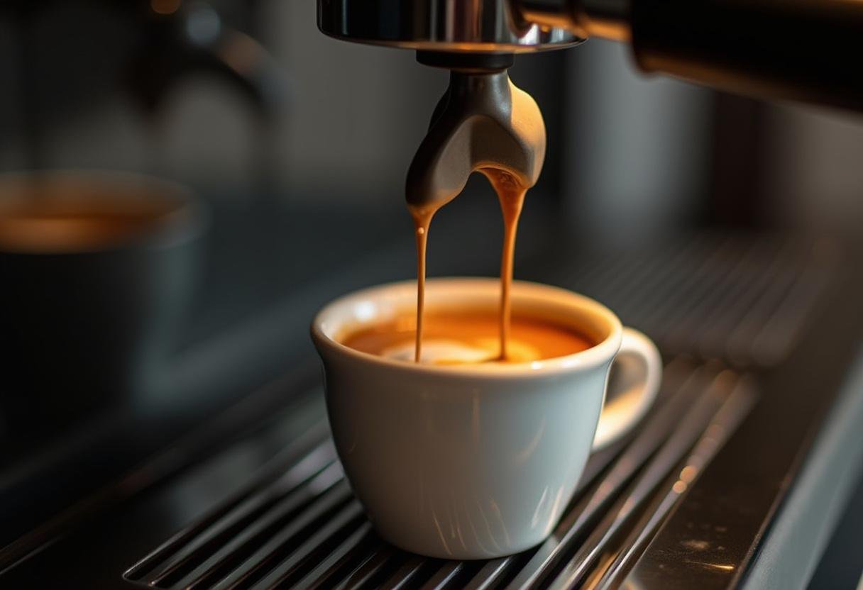 Shot de espresso siendo extraído para cafe flat white, mostrando una rica crema.