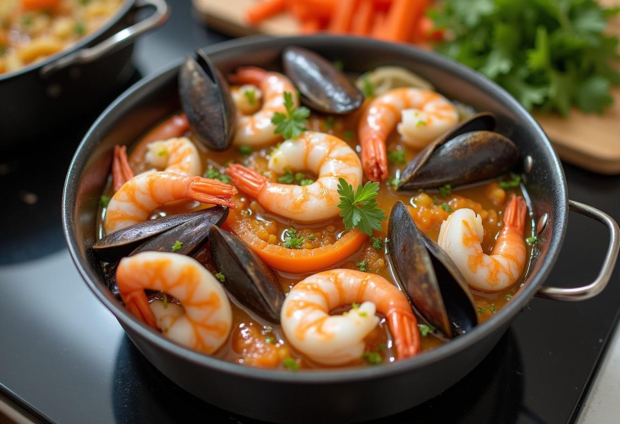 - Agrega los mariscos y mezcla bien. Cocina a fuego lento durante 5-7 minutos adicionales hasta que los mariscos estén completamente cocidos.